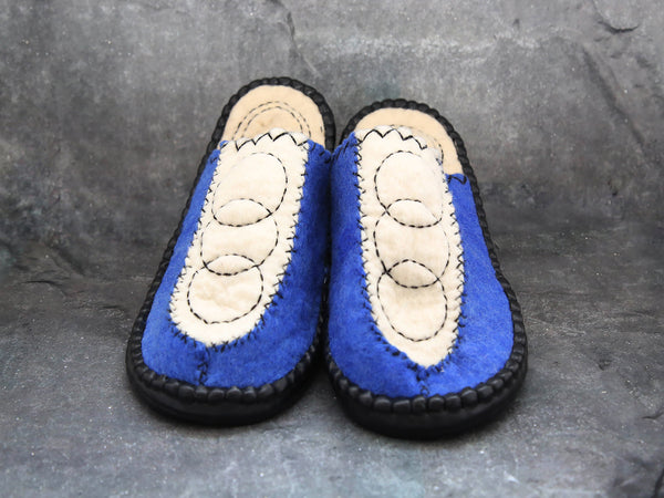 These slip-on slippers are made from felted natural white merino wool with coloured panels. They have a black leatherette sole and are finished with a hand-embroidered Mongolian pattern. Warm and comfortable, easy to wear.